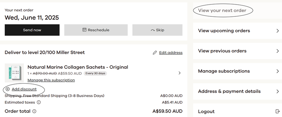 Navigate to ‘View your next order’ > ‘Add discount’